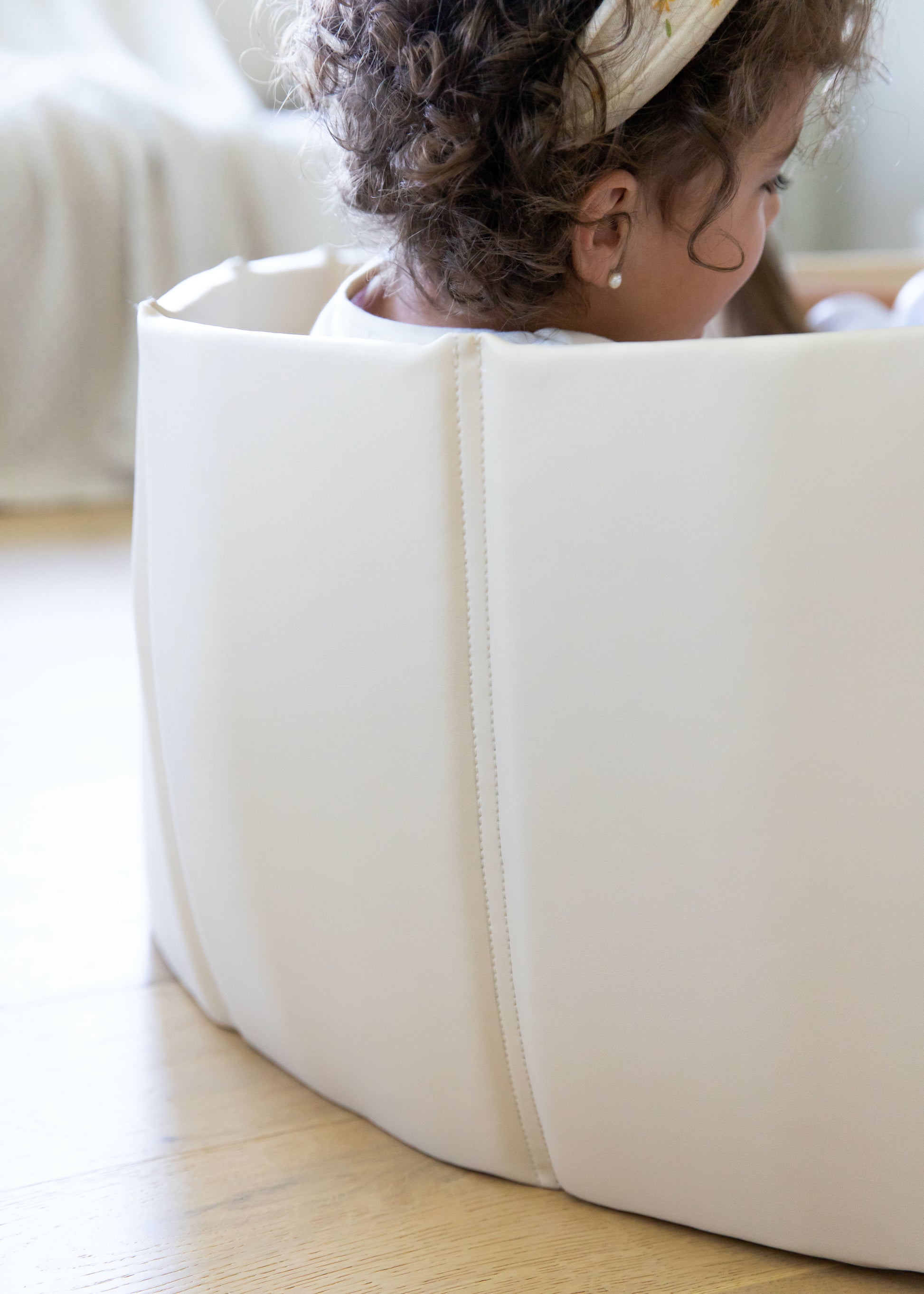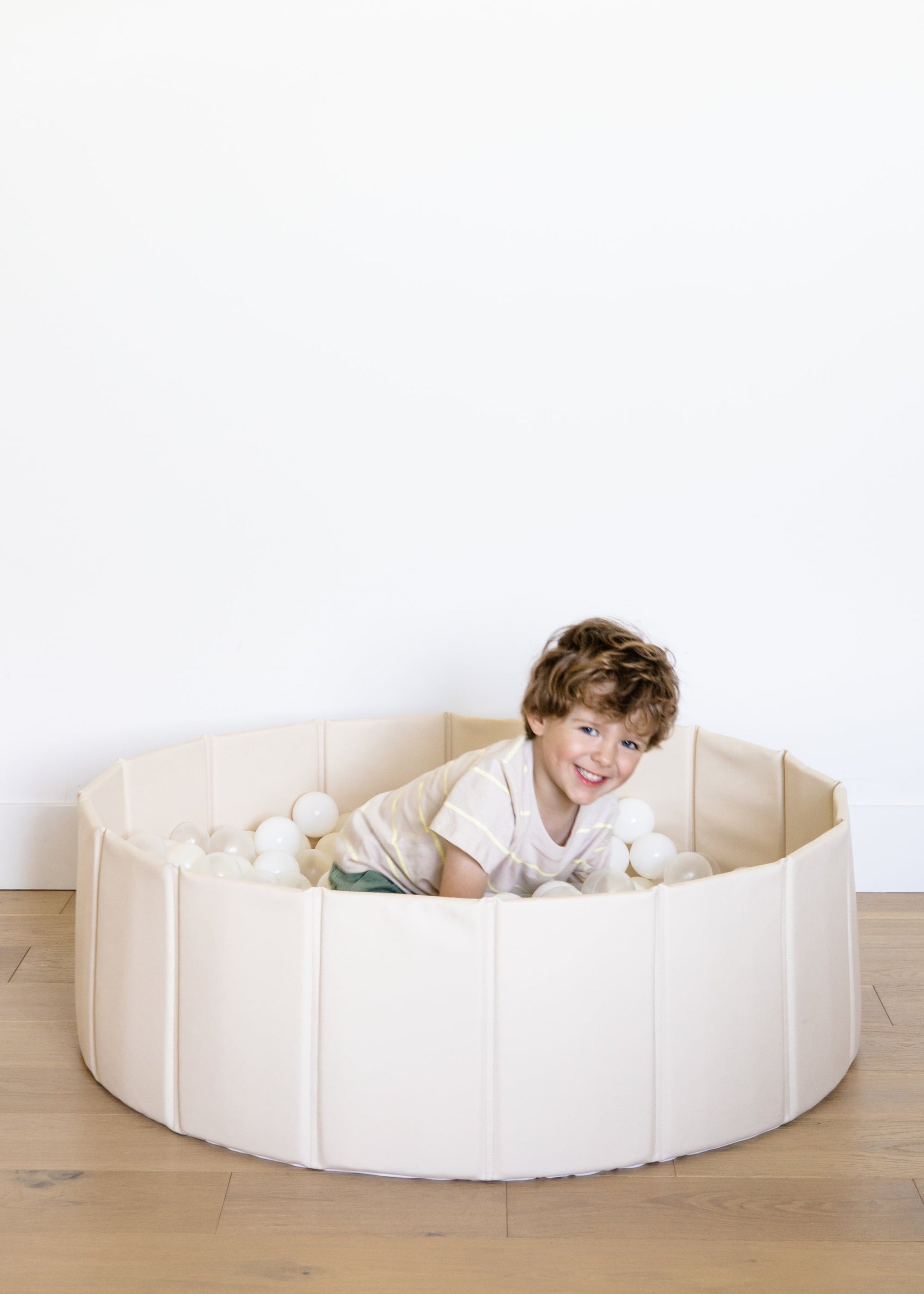 Made from a wipeable vegan leather, this foldable and easily portable play space can be used as a ball pit, foam pit, sensory pit, or pillow pit. Our Pit has foam siding and will come with a foam mat that you can insert into a zippered compartment in the base to further increase comfort for your littles. Please note the Pit does NOT come with balls included.